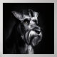 A dramatic close-up of a black and silver schnauzer with expressive eyes and detailed wiry fur, set against a dark background with moody lighting.