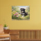 A soft, painterly scene of a schnauzer puppy playfully reaching toward blooming wildflowers in a lush spring meadow, featuring warm sunlight, gentle textures, and a dreamy, storybook atmosphere.
