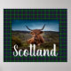 A poster apresenta uma fotografia de boi escocês Highland com uma grande cobertura de texto "Scotland". O plano de fundo é o padrão de latras Clan Sutherland da Highland