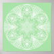Esta mandala branca senta-se sobre um fundo verde macio. As cores são serenas e criativas. Parte da coleção Howlsplann Mandala.