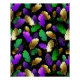 Seamless pattern of bright purple, green, and gold feathers on black Mardi Gras background. Design for the Mardi Gras holiday.