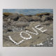 Um belo cenário no oceano. A palavra amor soletrado usando conchas brancas reunidas na praia.