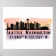 A impressão de arte apresenta a silhueta do horizonte da cidade de Seattle Washington com as coordenadas do mapa de cores d'água e latitude e longitude