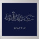 Esta design apresenta um esboço desenhado manualmente do horizonte de Seattle sobre um fundo azul escuro.