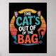 Este gráfico apresenta uma silhueta preta impressionante da cabeça de um gato, colocada contra um vibrante gradiente de pôr do sol em tons amarelos, laranja e azuis. O texto em negrito, "O GATO ESTÁ FORA DO SACO", é exibido de forma destacada dentro da silhueta do gato, com as palavras "CAT'S" e "BAG" em uma haste contrastante. Um rabo encurvado brincalhão acentua o design, enfatizando o idiota humorístico. Download digital apenas para uso pessoal.