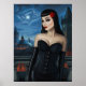 Pinup style digital painting de uma jovem de cabelo preto comprido, vestindo um espartilho. O pano de fundo apresenta uma vista noturna de uma cidade europeia fantástica.