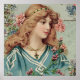 Esta imagem vitoriana excelente apresenta uma jovem com cabelo comprido e uma blusa azul que tem flores rosa e azuis ao seu redor e no cabelo. Use este design para qualquer ocasião.