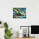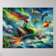 O óleo de abstrato pintou o olhar com uma foto de uma sereia de uma barbatana tópica em vermelho e verde sentado em uma rocha com o oceano e outros cinco peixes tópicos coloridos e baleias e focas ao seu redor com um céu azul. algas verdes flutuando. Este design apresenta cores brilhantes de relâmpagos dourados e uma pose poderosa .com pingos de tinta nele