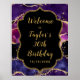 Este elegante e glamouroso sinal de boas-vindas festas de aniversário apresenta um fundo de mármore roxo escuro com sotaques dourados falsos. O texto combina o script manuscrito e as fontes sans serif modernas para um aspecto elegante e sofisticado. As sequências e a textura em apuros criam a mistura perfeita de chic e grunge.