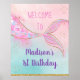 Bem-vindos aos convidados do seu partido com um sinal personalizado adorável. Enquadre o sinal e exiba-o numa mesa perto da entrada ou monte a espuma poster e mostre-a fora em um calcanhar. A design apresenta uma cauda colorida de sereia com embelezamentos falsos de ouro brilhante.