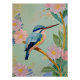 Uma ilustração vibrante e estilizada de um rei-pescador pregado num galho, cercado por uma folhagem luxuosa e flores florescentes. O pássaro é o ponto focal, com sua cabeça e asas azuis e brancas marcantes, e uma mama cor-de-rosa macia e pêssego. Tem um bico longo e escuro com uma base vermelha e um olho vermelho brilhante. O fundo é um aqua verde macio e mudado, criando um cenário tranquilo para a flora abundante. Flores grandes, delicadas, cor-de-rosa e brancas, além de folhas verdes e outras formas florais abstrato, armam a ave, enchendo a composição com um sentido de beleza natural e elegância. A trabalho de arte tem uma sensação suave e decorativa, celebrando os detalhes complexos da natureza.