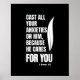 Traga paz para o seu espaço com este design ousado e minimalista que apresenta as palavras confortantes de 1 Peter 5:7: "Dê-lhe todas as suas ansiedades, porque ele se preocupa consigo." Colocada contra um fundo negro impressionante, a mensagem se destaca em branco com uma pena delicada simbolizando a leveza e o cuidado divino. Esta peça é perfeita para acrescentar um elemento de reflexão espiritual a qualquer sala, oferecendo um lembrete diário da fé e da confiança.