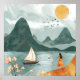 Fuga a um mundo de tranquilidade com a serenidade pelo mar, um trabalho de arte cativante que captura a essência da beleza costeira e da exploração pacífica. Esta peça apresenta uma paisagem serena com tons suaves e pastéis de azul e laranja, criando uma experiência visual tranquila. O motif central mostra um veleiro a navegar por águas calmas, acompanhado por uma figura em um vestido laranja parado na costa, braços estendidos, abraçando a liberdade do momento. O fundo é adornado com ondas suaves, montanhas distantes, e um bando de pássaros voando em direção ao sol, evocando um senso de aventura e harmonia com a natureza. Perfeito para aqueles que buscam trazer um toque de charme costeiro e serenidade para seus espaços de vida.