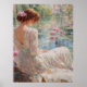 An exquisite painting capturing a tranquil scene: a woman in a flowing dress sits gracefully by a pond adorned with vibrant pink water lilies. This artwork evokes a profound sense of peace, natural beauty, and gentle contemplation.