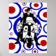 patinete branco e preto desenhado à mão, de 60 anos, sobre design branco e azul-alvo, presente de excelente ou convites para qualquer amante de 60 mod patinete
