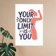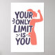 Um poster de motivação para estudantes e mulheres empresárias. Texto roxo e a citação: Seu único limite é você. Um gráfico de uma mulher forte.