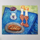 Uma pintura original de Adela Camille Sutton, inspirada no dia do descanso, O Baco Judeu, o pão braid de chalá, um copo de vinho, e velas adornam esta mesa abençoada