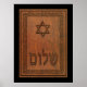 Apresenta uma "esculpida de madeira antiga" gerada por computador de uma Magen David (Estrela de David), texto lendo "Shalom" e uma borda floral.