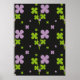 Padrão floral uniforme original, shamrocks verdes e roxos de sorte em fundo preto.