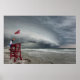 Eu estava perseguindo uma tempestade avisada severamente perto de Ormond Beach, FL no dia 14 de maio de 2012; quando decidi correr até a praia e pegar algumas fotos enquanto ela se aproximava. O que eu vi foi uma enorme, bem definida nuvem de prateleiras. Havia vários bebedouros de praia, tirando fotos com suas câmeras de apontar e fotografar, assim como alguns surfistas ainda na água. Eu vi o salva-vidas, e esperei que ele subisse em sua estante para dizer àqueles na água para saírem imediatamente. Uma vez que o fez, eu andava por trás da bancada, e capturei esta foto.