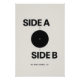 L’affiche se divise visuellement en deux zones verticales. À gauche : « SIDE A » ; à droite : « SIDE B », parfaitement équilibrés. Au centre, une fine ligne sépare les deux champs. En bas, un minuscule texte technique indique « 33 1/3 RPM – stereo – 12” ». C’est une affiche-concept, un objet éditorial graphique suspendu entre texte et son.