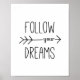 Um impressão de arte motriz e motivacional com uma simples citação de tipografia negra com uma seta desenhada à mão que diz "Siga seus sonhos".
