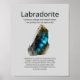 Labradorite é uma pedra de transformação e mudança. Ela melhora o despertar espiritual, a intuição e as habilidades psíquicas. Este cristal protege a aura, banindo medos e inseguranças enquanto promove a autodescoberta e a força interior.