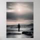 Uma obra de arte minimalista que retrata uma figura solitária diante da vastidão do mar, com tons mudos e frios que refletem a melancolia. O horizonte distante sugere isolamento, enquanto a luz e a sombra amplificam o senso de vazio.