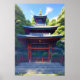Uma representação de arte digital silenciosa de um pequeno templo japonês escondido em frente a uma floresta grossa e verde. O templo emana uma ambição serena e pacífica que convida os visitantes a parar, respirar e ponderar. É a ilustração ideal da beleza silenciosa dos santuários japoneses por causa da folhagem verde-luxuosa que a rodeia, que contribui para o sentido de beleza natural e tranquilidade da cena.