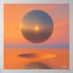 A huge metal sphere floats above a perfect circle carved in the sand. Around it, a turquoise sky fades to orange: the silence of a motionless orbit.