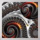 Impressionante fractal de Mandelbrot, prata e laranja, com espirais e uma esfera refletindo a imagem