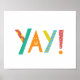 Design de tipografia moderna e branca em verde, azul, vermelha e laranja com a palavra "Yay!". Design por Shelby Allison.