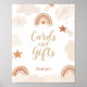 Esse sinal de Cartões e Presentes de Chá de fraldas é parte da coleção de chás de fraldas Boho Rainbow, caracterizada por gráficos giros do arco-íris e cores neutras, que é adequada para o garoto e a garota, ou chá de fraldas neutro em relação ao gênero. Este sinal é fácil de corresponder às suas cores.