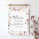 Este clássico sinal de boas-vindas do brunch floral floral selvagem é perfeito para um casamento simples. A design apresenta flores silvestres brancas, amarelas, roxas e brancas com folhagem em fundo de rosa e aquarela verde. Faça esta poster com o nome da noiva e do noivo, e a data do casamento.