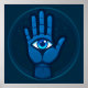 Uma representação estilizada de uma mão com um olho na palma, com uma estética azul cósmica. A imagem sugere misticismo, espiritualidade e proteção, evocando temas do Hamsa e do olho que tudo vê.