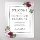 Elegante floral "bem-vindo à nossa cerimônia desplugada" cantando em cores de burgundy, blush e prata para que seus convidados de casamento saibam por seus telefones e câmeras durante sua cerimônia de casamento. Itens correspondentes disponíveis.