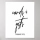 Este cartão de caligrafia e sinal de presentes é perfeito para um casamento ou chá de panela moderno. A design apresenta uma tipografia elegante, mas rústica, para um simples aspecto mínimo. A linha de texto na parte inferior da placa pode ser personalizada com a data, os nomes da noiva e do noivo, ou uma mensagem curta como "Obrigado". Este sinal pode ser usado para um casamento ou qualquer evento ou festa.