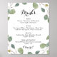 Este cartaz de cardápio de bebidas de eucalipto é perfeito para um casamento rústico. A design apresenta galhos e folhas de eucalipto verde botânico desenhados à mão.