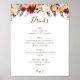 Este cartaz de cardápio de bebidas florais cor de laranja arrojada é perfeito para o seu casamento rústico com borrão, verde escuro e jardim de ouro. Design apresenta uma coroa ou buquê de pêssego de cor d'água minimalista, rosa poeirento, roxo e rosas claro florais juntamente com cobre, verde, amarelo e verde cor de ferrugem. As flores nesta design são papoila, rosa e pedônia. O design é ideal para um simples e elegante primavera, verão ou casamento no outono. Por favor, encontre outra papelaria de casamento no resto desta coleção.
