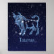 Impressão com o símbolo de Taurus em azul-prateado suave, sobreposto com as estrelas da constelação, contra um fundo de céu estrelado formando de azul-da-meia-noite a preto.