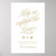 Barato personalizado imprimiu um cartaz de casamento em grande escala personalizado com sua hashtag de casamento para os convidados compartilharem suas fotos com você nas redes sociais. Mantenha o esquema clássico de ouro e cor branca com a letra elegante do script de caligrafia, como mostrado, ou use as ferramentas de design para escolher uma cor de fundo diferente para corresponder perfeitamente ao tema do casamento. Adicione um quadro ao check-out ou escolha um tamanho de poster personalizado para ajustado de qualquer quadro.