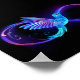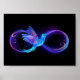 Símbolo luminoso, roxo e infinito com beija-flor azul voadora, luminosa, em fundo preto. Neon.