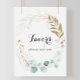 Este sinal de favores florais de ouro de eucalipto rústico é perfeito para um simples casamento ou chá de panela. Este design artístico apresenta folhagem verde de ouro, feita à mão, floral e aquarela, eucalipto, belamente organizada numa elegante moldura geométrica.