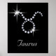 O impressão de poster de vidro cintilante apresenta o símbolo zodíaco / astrológico para Taurus em rochas de diamante em fundo preto. Taurus é designado para esse nascer de 21 de abril até 20 de maio
