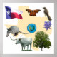 Definido em fundo branco, o mapa do Texas é sobreposto pelo Selo do Estado, a Bandeira do Estado, e adotou oficialmente símbolos vegetais e animais do Estado: a flor de Bluebonnet, a Borboleta Monarca, o Mockingbird, o Armadillo, o Bovinos Longhorn e a Árvore Pecan. É fácil mostrar orgulho em seu Estado!