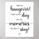 Esta simples poster de caligrafia negra e memórias é perfeita para um casamento temático rústico ou moderno. A placa diz "arrisque a ressaca! ela dura apenas um dia, mas as memórias estão aqui para ficar!". A design minimalista apresenta uma elegante letra de escrita de pincel e um adorável coração feminino.