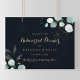 Este janto de ensaio horizontal, bem-vindo, sinal azul é perfeito para um ensaio de casamento simples. Este design artístico apresenta folhagem verde de ouro, feita à mão, e cor d'água, eucalipto, em um fundo azul escuro, inspiradora beleza natural.
