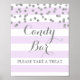 Poster de sinal de bar de doce para chá de fraldas, chá de panela ou casamento em um padrão de riscas brancas e roxas de lavanda clara com confete prateado, por favor note que prata é apenas efeito fotográfico. Perfeito para um chá de fraldas, casamento ou chá de panela.