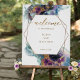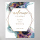 Sinal de boas-vindas Elegante do Casamento com manchas de aquarela refinadas em matizes de galáxia cósmica com estrelas delicadas em cascata atrás do hexágono geométrico do ouro com mensagem de boas-vindas com nomes de casais. Capacidade de alterar o texto para atender a outros eventos. Manchas de aquarela numa mistura de tons azuis, marinhos, lacas, turquesas, roxas, fúcsia e ouros. Detalhes da caligrafia escrita à mão. Disponível no tamanho médio de 24" x 30" e em muitos outros tamanhos menores para escolher. Fácil de enquadrar ou, em alternativa, colar/grampear para suportar MDF barato. Design na posição vertical/retrato. O mesmo design na opção horizontal/paisagem também está disponível. Parte da nossa coleção "Mystic Garden Celestial" com uma variedade de produtos de coordenação disponíveis. Dimensões do sinal na foto de demonstração com suporte: 18" x 24"