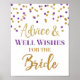 Conselhos e votos de felicidade para o sinal da noiva para o chá de panela em padrão de confetes dourados e roxos escuros. Por favor, note que o efeito de brilho é apenas efeito fotográfico.